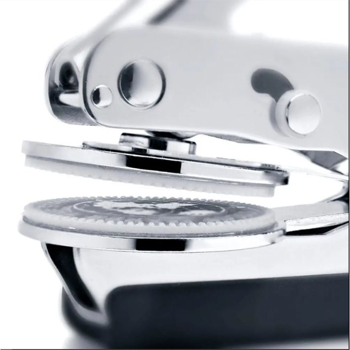 Pressa per carta con piastra rotonda personalizzata ø 51mm, consigliata come articolo da regalo o per promozione aziendale.